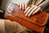 The Florentine Clutch redefines elegance with its handcrafted patterns. This versatile accessory is suitable for stylish evenings and chic business meetings. This extra-long statement piece has the power to enhance any outfit. The small loops on the sides allow you to transform it from a clutch into a crossbody bag, or you can pair it with one of our chunky metal chains for a luxurious evening look. Inside, it offers ample space for a large phone, keys, and makeup essentials like lipstick and blush. Please note that metal straps and chains are sold separately.